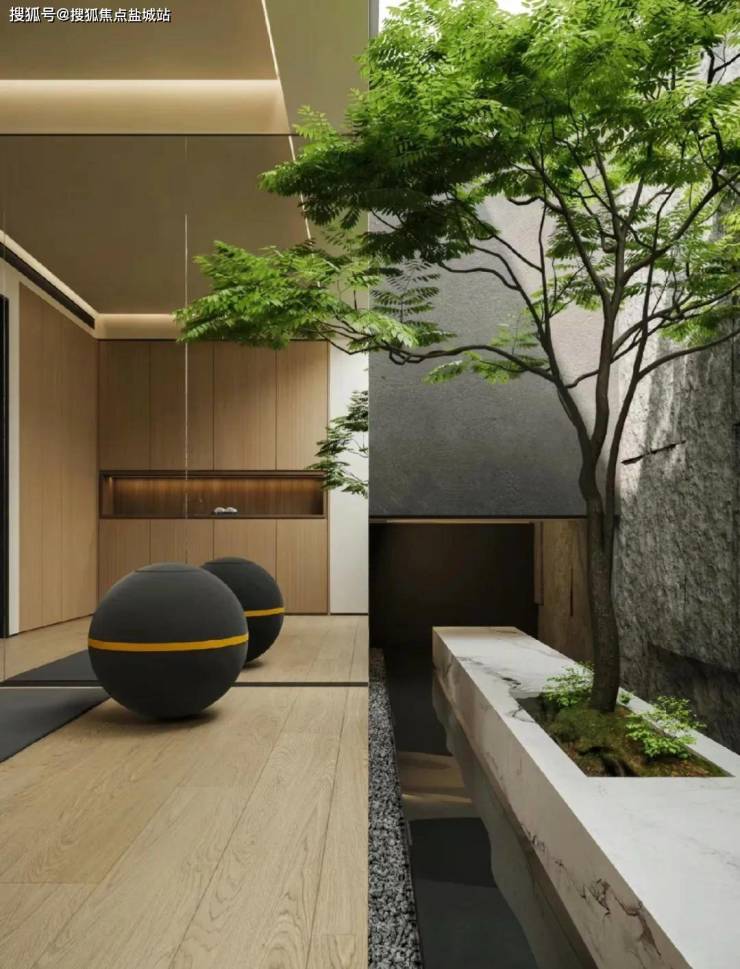 负一层整体空间的功能围绕着“放松”二字。影音室、棋牌区、红酒柜、健身区、瑜伽区,完美呈现出主人休闲娱乐场景。还可利用一层的采光井做出室外茶室的空间,让社交出现了一丝自然的场景。茶室与绿植景观融为一体,让生活充满自然的味道。