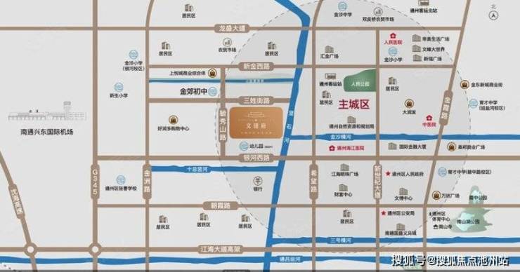 文璟府坐落于南通市通州区银河路北侧、毓秀山路东 ,地处银河新区核心板块,这一区域定位为 “通州城西生态宜居新区”,在通州城市发展格局中占据关键地位,是推动城市转型、提升人居价值的前沿阵地 。项目总建筑面积约 157,506.52 平方米,周边城市界面良好,有多条城市主干道环绕,约 2 公里范围内生活配套完善,具备打造高品质居住社区的先天优势 。项目周边公共交通网络较为发达,为居民日常出行提供了多样化选择 。直线 1 公里内分布着多达 15 个公交站 ,其中金郊初中站距离项目仅 421 米 ,胜利桥等站点也在附近 。像 208 路、232 路等公交线路途经这些站点,可通往通州城区各处,满足居民前往商场购物、学校接送孩子、医院就医等日常出行需求 。虽然目前南通地铁尚未延伸至该区域,但随着城市轨道交通规划的持续推进,未来存在地铁线路覆盖的可能性,届时公共交通便利性将实现质的飞跃 。