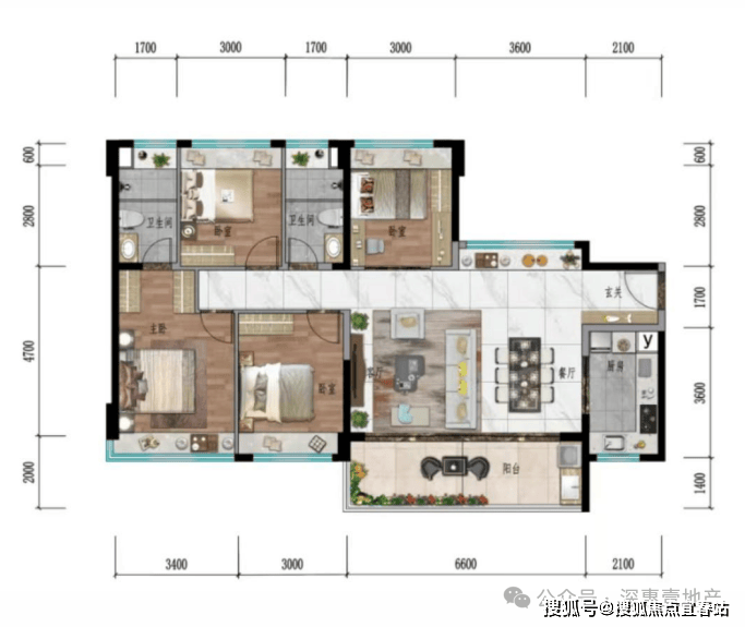 『南北通透双阳台 南向四开间』:118㎡户型 四房两厅两卫