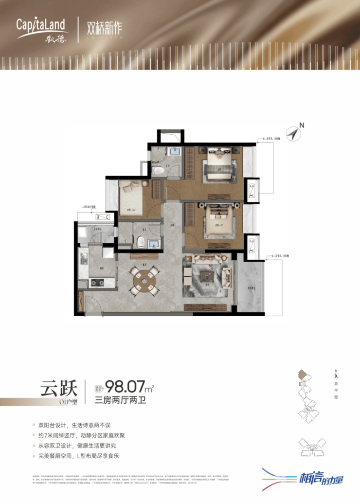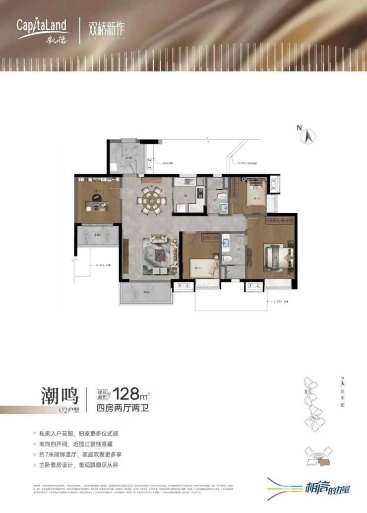 双桥新作规划三栋住宅,共411套精品住宅,户型涵盖74-128㎡二至四房,多样化的户型产品满足不同客户需求,同时打造层次丰富的园林景观,配置全龄活动空间,全新概念的空中跑道。