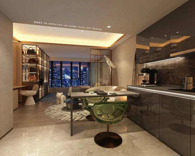 软装搭配以平和温润的色调和极简艺术为主导,平衡了硬装的商务感、居住的休闲需求与空间艺术性,实现三者和谐共生。
