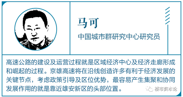 中国城市群研究中心马可看来,高速公路的建设及运营过程就是区域经济中心及经济走廊形成和崛起的过程。京雄高速将在沿线创造许多有利于经济发展的关键节点,考虑政策引导及区位优势,最容易产生集聚和协同发展作用的就是靠近雄安新区的头部位置。