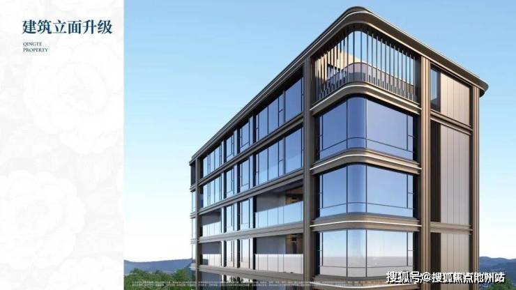 建筑立面采用南向铝板+LOW-E玻璃,搭配香槟金色金属线条,整体轻盈现代,充满镜面艺术感。
