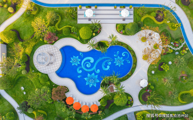 另一处是流线型的异形景观泳池,形状似绽放的花瓣,优雅地融入蓝色水面,为周围景观增添灵动之美。