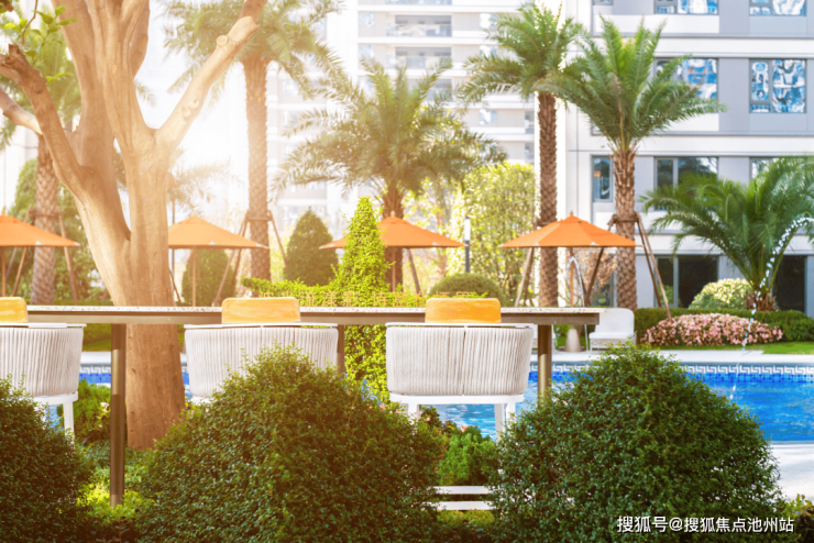 景观泳池边上,还做了景观艺术吧台。池的两侧,是“几何花园”、“馥郁花园”两座绿意盎然的“生态氧吧”。