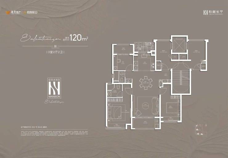 建面约120平的3房2厅2卫,类一梯一户+南北双阳台设计,北侧阳台可以拓展次卧的使用面积。