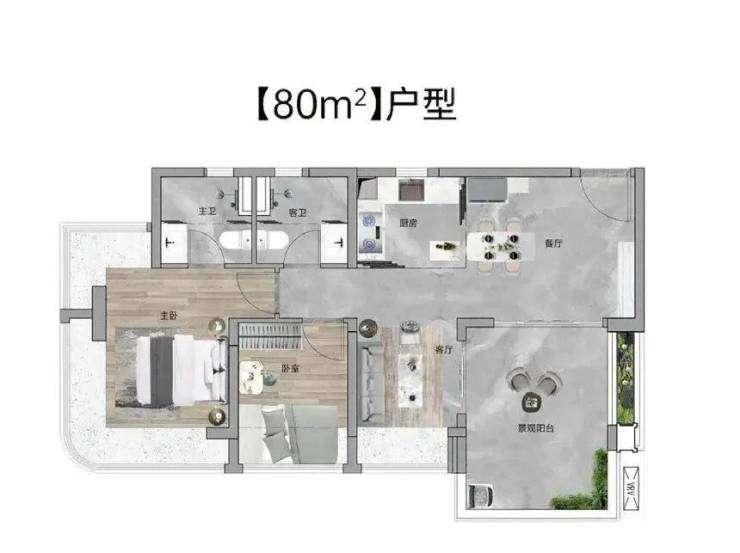 以 80㎡三房为例,通过 “LDKB 一体化 + 灵动空间” 设计,实现四开间朝南,主卧带 270° 弧形飘窗,实际使用面积约 82㎡,相当于传统 90㎡户型的空间感;