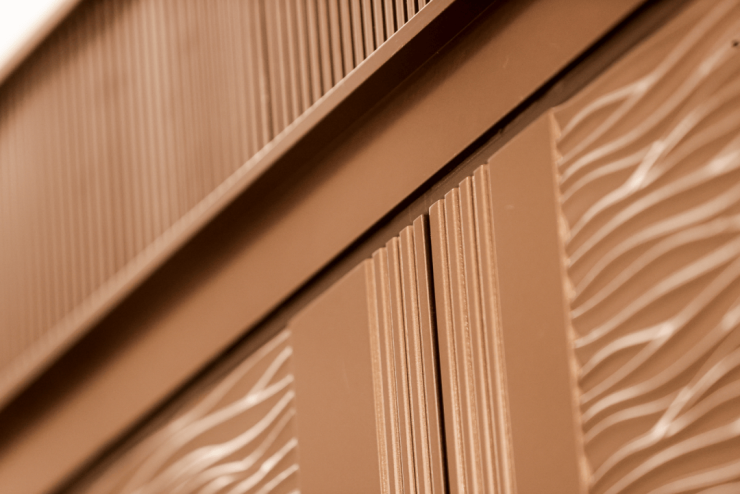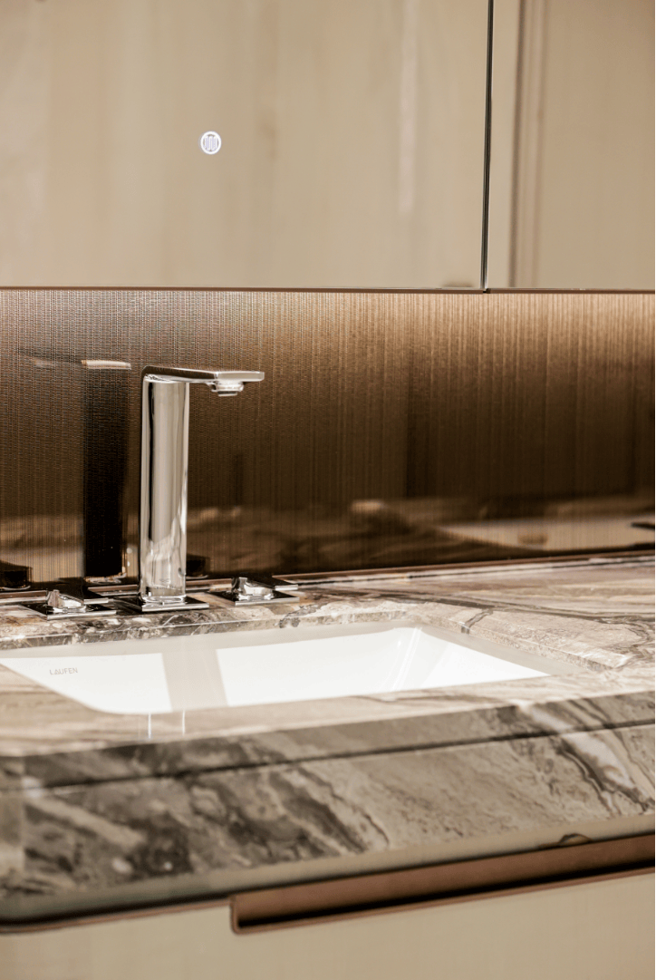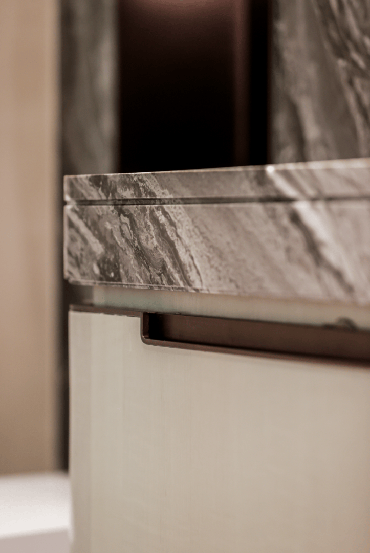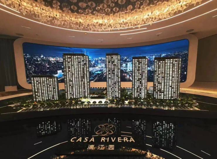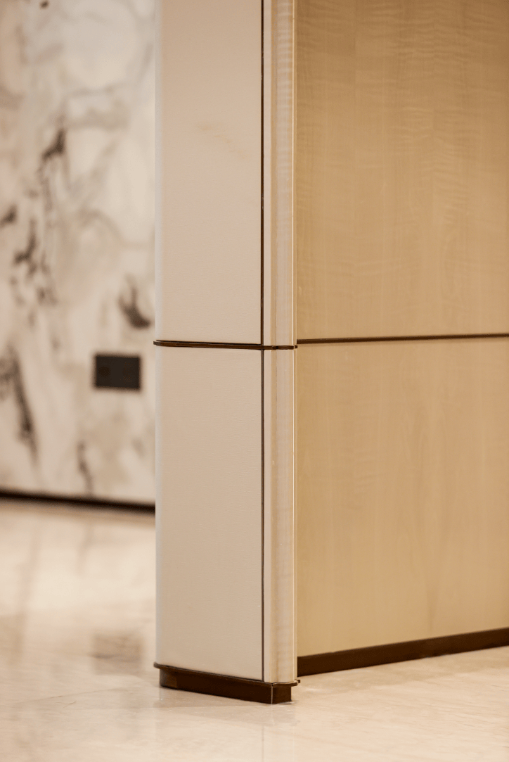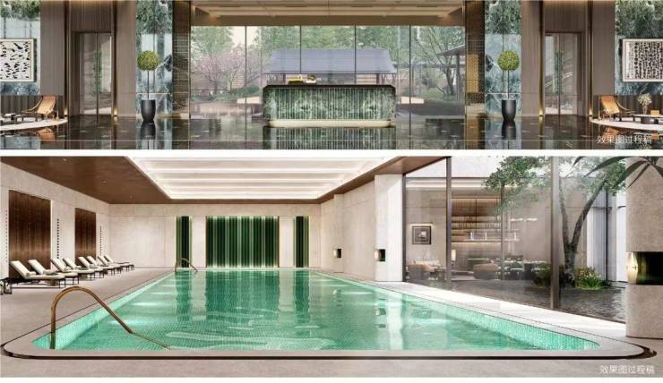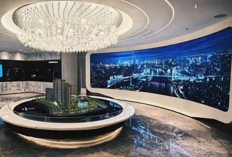 绿发在细节上更是舍得花钱,大面积的岩板、皮革,弧形设计等高造装饰在项目随处可见