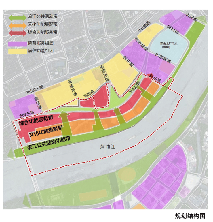 其中,明确提出形成三条平行岸线的功能带:一是滨江公共活动功能带,延续滨江贯通需求,增加游憩、休闲、展示和运动等配套设施,集聚最活跃的公共活动功能;二是文化功能集聚带,核心文博设施引领,配套布置文化、商业、休闲等活动功能;三是综合功能服务带,布置文化产业衍生的商务、商业、居住等功能,强调功能的立体复合。
