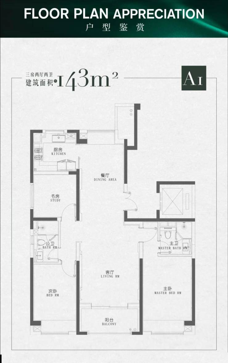 项目总建面约140214㎡,容积率2.89,绿地率35%,完全人车分流,车位比1:1.2,封阳台。