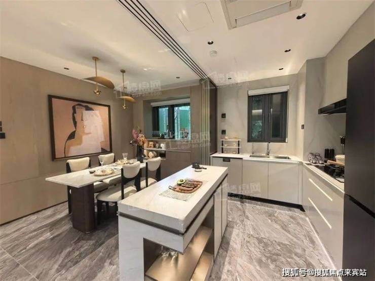 厨房采用“U型+岛台”设计,配备品牌橱柜及抽拉式水龙头;