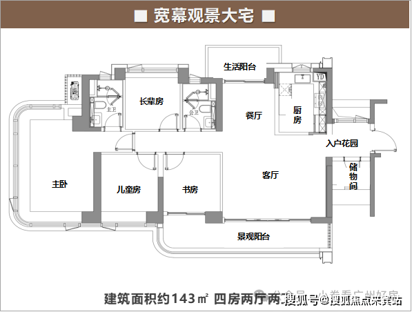143㎡四房:创新“LDKB”一体化设计(客厅+餐厅+厨房+阳台),阳台进深达2.4米,可改造为茶室或健身区;