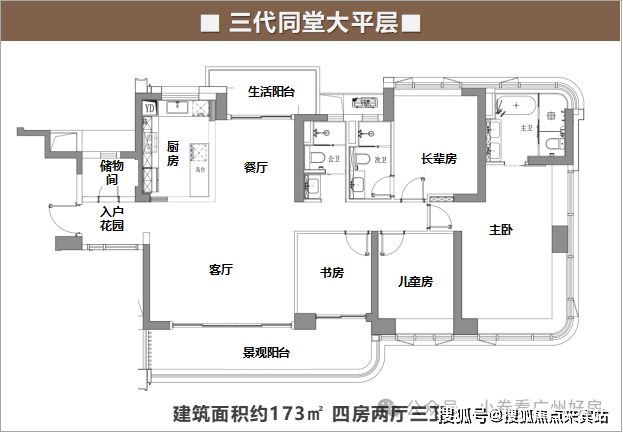 173㎡五房:双套房设计,主卧配备270°观景飘窗,次卧带独立卫生间,满足二孩家庭需求。