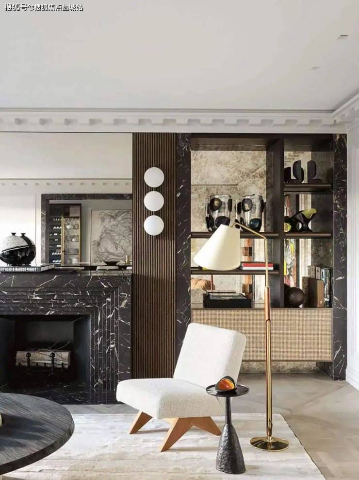 客餐厅三段式功能布局,空间连贯一览无余,让豁亮的心情又无法抗拒。梅维拉的雾化壁炉前是一对单体沙发,既是端景也是空间最好的分割线,一边是家人闲坐,一边是会客品茗。地面满铺鱼骨拼木地板,米黄色编制墙布搭配仿金属漆的星空造型图案,精致又神秘,在13m进深的采光落地窗下,即使再挑剔,也没了脾气。