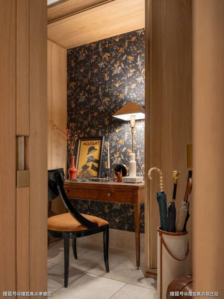 天潼198售楼处预约电话:400-000-0460转6666欢迎预约咨询☎玄关具有变化性与功能多重性,壁纸融合中西方色彩和纹样,除了更衣功能,更摆放了古董书写桌,以手写文字传递信息,传递慢节奏生活方式,丰富空间的装饰和功能,目光所及视角变得丰富。