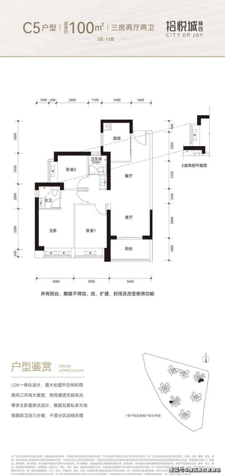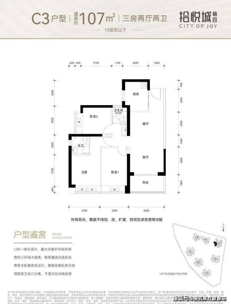 100㎡的3房2厅2卫,设计的是竖厅格局,进门入户玄关,客厅3.4米开间,LDKB一体化设计,3个卧室分别做到了3米/2.9米/2.5米的宽度,U型厨房,公卫三段式分离,阳台1.8米宽度,西南或东南朝向。