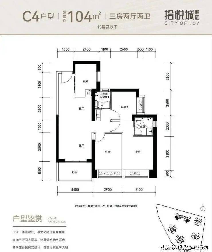 104㎡的3房2厅2卫,设计的是经典竖厅格局,进门入户玄关,客厅3.4米开间,LDKB一体化设计,3个卧室分别做到了3.1米/2.9米/2.5米的宽度,U型厨房,公卫三段式分离,阳台1.8米宽度,西南或东南朝向。