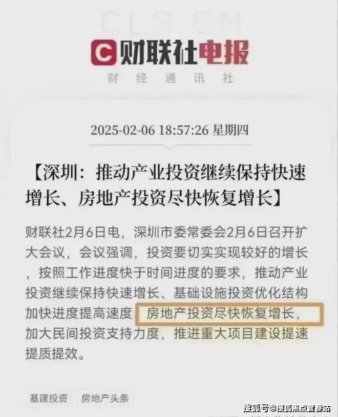 财联社2月6日电,深圳市2月6日召开扩大会议,会议强调,投资要切实实现较好的增长,按照工作进度快于时间进度的要求,推动产业投资继续保持快速增长、基础设施投资优化结构加快进度提高速度、房地产投资尽快恢复增长,加大民间投资支持力度,推进重大项目建设提速提质提效。