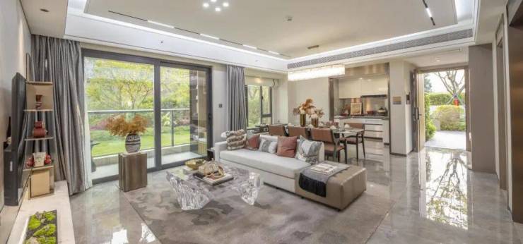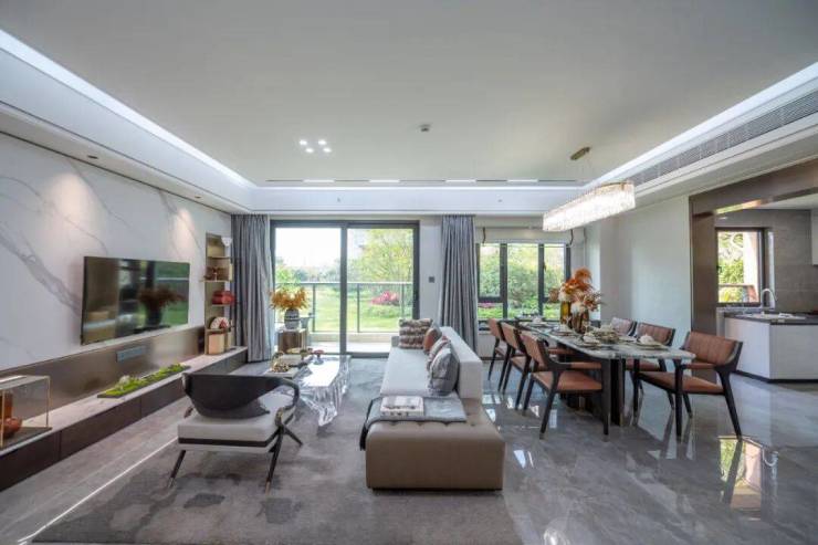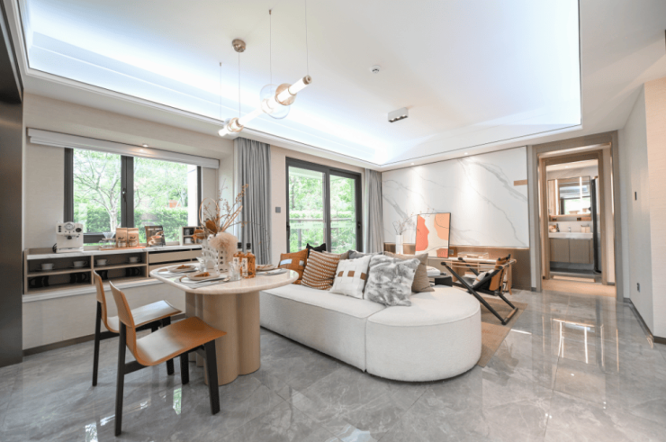 三开间朝南,清风与阳光自由穿梭,呼吸尽是鲜氧,推窗即览园林景致,客厅衔接观景阳台,在阳光漫溢的空间里,家人围坐闲聊或亲友小聚,从容惬意。