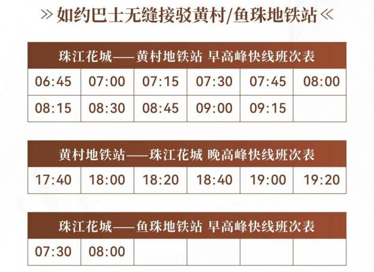 在出行方面,家门口的如约巴士地铁专线已运营 , 无缝接驳地铁4/21号线黄村站、5/13号线鱼珠站, 更在 高峰期间加密班次 ,提高通勤效率,快速抵达珠金琶CBD,轻松平衡工作与生活。