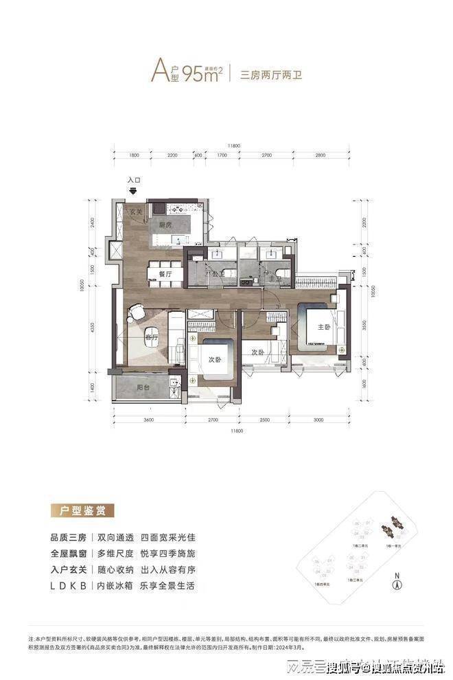 建面约95㎡三房两厅两卫:竖厅设计,实用率约93.6%,西南或东北朝向。LDKB一体化使得空间更加通透,动静分区合理