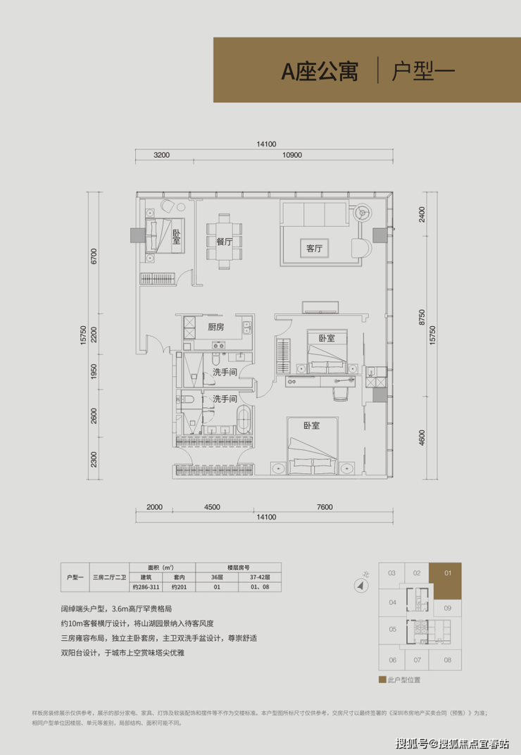 整个项目包括3栋住宅、1栋5A超甲级写字楼(含63套总裁公寓),1栋超高层公寓,约2万㎡商业配套,及幼儿园、露天泳池等配套。