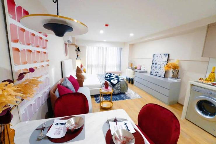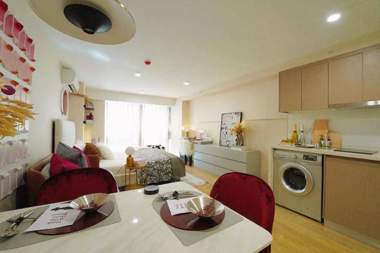 ❶ 精致空间,巧妙布局:这处样板房以约50平方米的建筑面积,展现出了非凡的生活尺度。其层高更是达到了4.78米,营造出一种宽敞明亮的居住氛围。