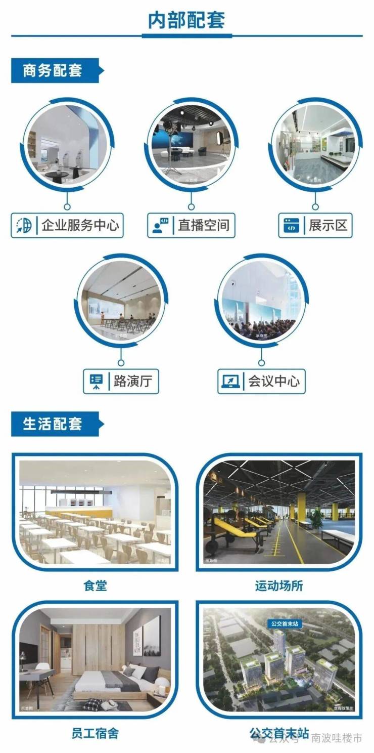 园区配套:企业服务中心、直播空间、展示区、路演厅、会议中心等服务配套,及公交首末站、商业、宿舍、食堂、运动场所等