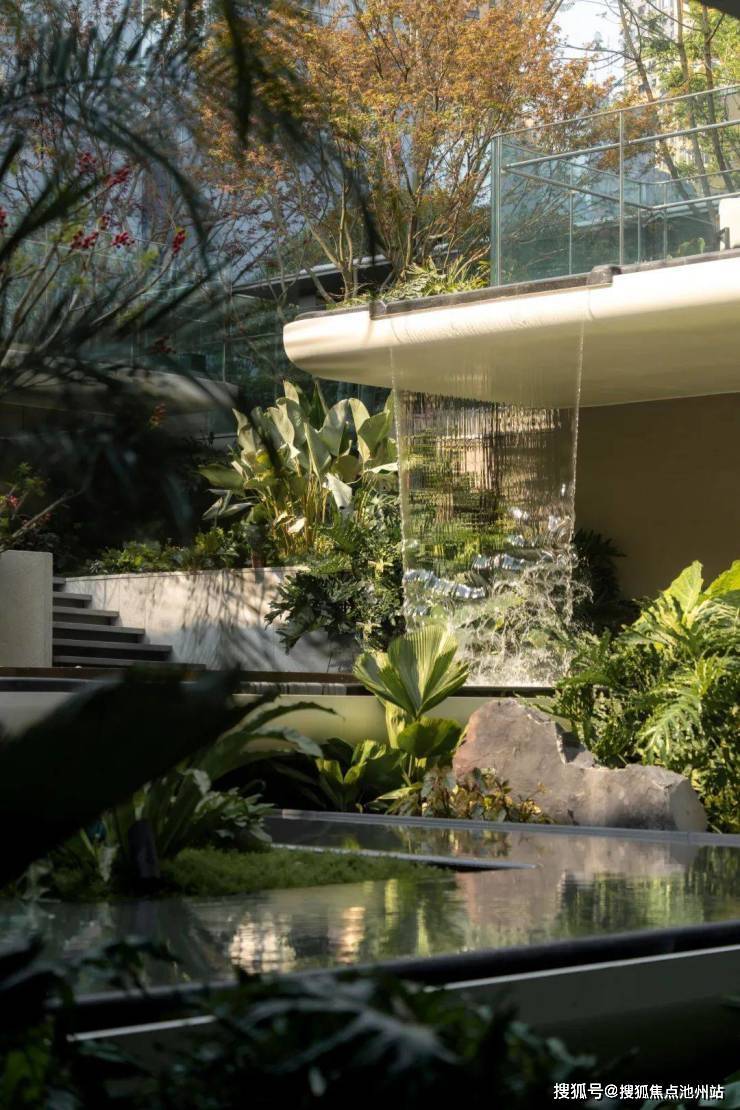 嘉宸在归家动线的考量上,也呼应江岸漫步的自然感受。以艺术穹顶大堂为核心,穿过酒店式落客区,悬瀑叠水穿园流过,归家入园的生机绿谷悠然有力。