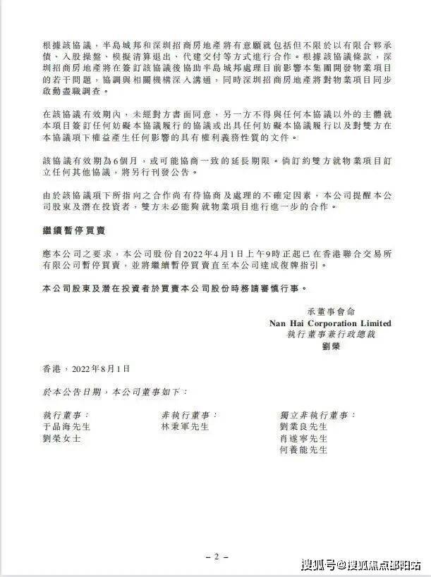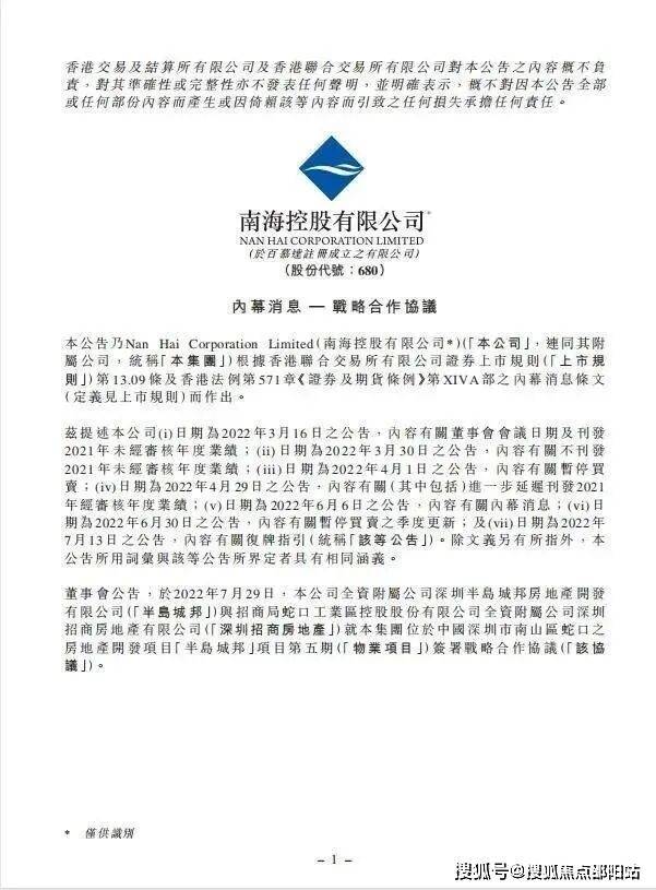 2022年8月初,招商蛇口发布公告:子公司深圳招商房地产与半岛城邦房地产签订战略合作协议,双方有意向通过债务重组、股权重组、管理重组、代建代销售等方式,分步骤解决半岛城邦房地产面临的问题,推动深圳半岛城邦第五期项目的顺利进行。