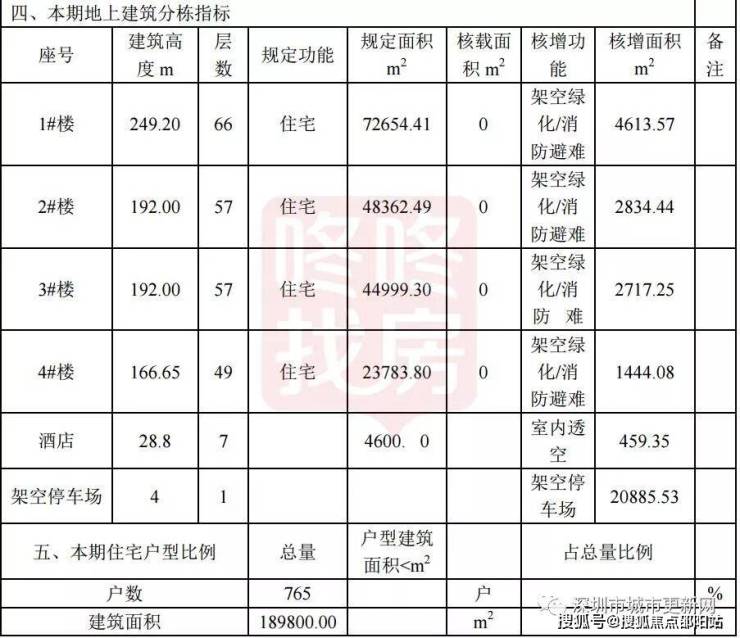 其中,1#楼(66F,249.20m)、2#楼(57F,192.00m);3#楼(57F,192.00m)、4#楼(49F,166.65m)、酒店(7F,28.8m)。