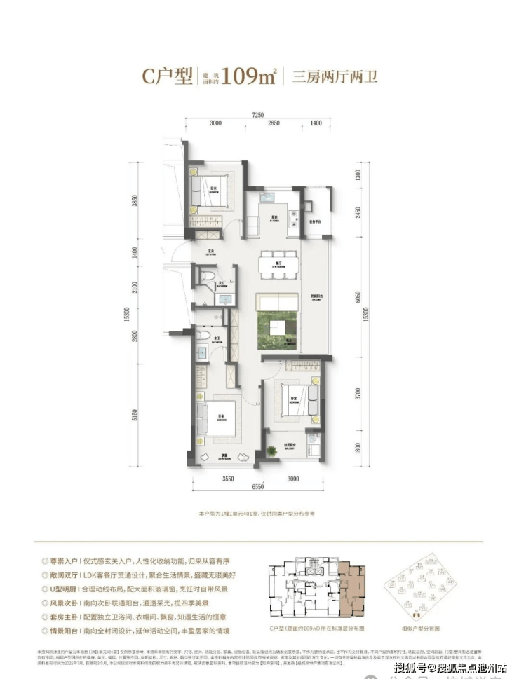 109方户型:三房两厅两卫,独立玄关,横厅边套,生活阳台+休闲阳台(全包),近13米采光