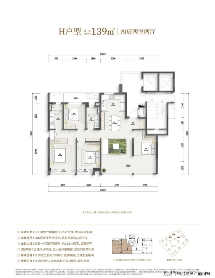 128方户型:四房两厅两卫,独立玄关,横厅边套,三卧朝南,生活阳台+休闲阳台(全包),近16米采光面