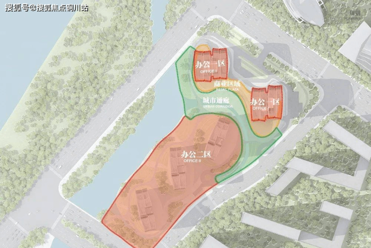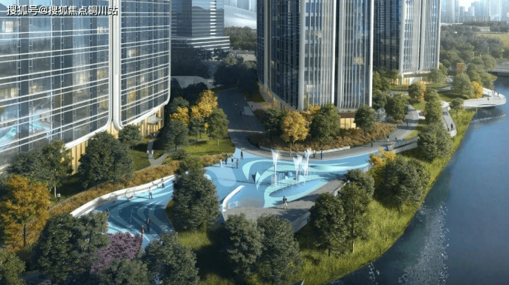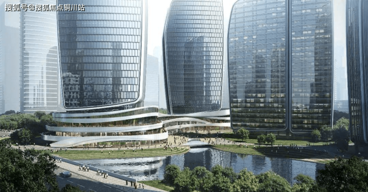 建筑布局运用中国传统园林中“师法自然”之手法,设计引入景观水系结合河畔自然景观,形成“融汇贯通,合而不闭”的流动空间环境。总图布局中五栋塔楼呈扇形错落分布,最大化每栋建筑的全江景朝向。景观水系将场地一分为二,北侧双塔为办公一区,两座高端商务总部办公楼通过裙楼商业空间彼此连接,主入口集中朝向东北侧城市广场界面,最为便捷的城市交通;南侧三塔为办公二区,板式塔楼相对私密宁静,并拥有更开阔的江景。两区功能多样,可分可合,视野开阔,以动静相宜的城市景观通廊紧密连接。