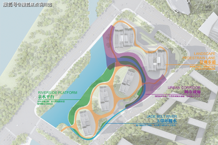 基于自然理念,设计将多种功能围绕中心景观展开,围绕水滨环境打造出多维度城市乐活空间,自然实现产城融合。设计充分利用新先锋河景观优势,以休闲商业水岸广场,台阶式绿色自然景观空间,营造出动静两相宜的不同氛围的自然亲水环境。并以漫步廊道等大量公共空间错落布局于建筑与河道之间,在尺度不一的建筑首尾相接中,形成四通八达的流动气场,为使用者提供全新的休闲场所。