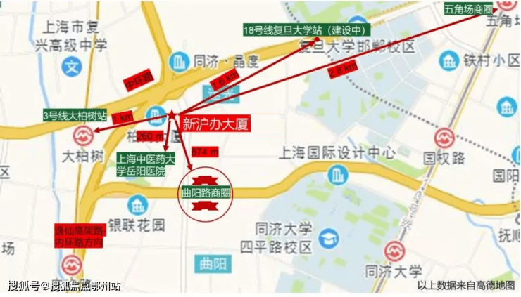 项目位于虹口大柏树地区,毗邻逸仙高架、中环路交错口,前往上述两个高架的距离大约150米,附近有三号地铁站大柏树站,步行约750米,同时开车出行到五角场核心商圈仅2.5km.