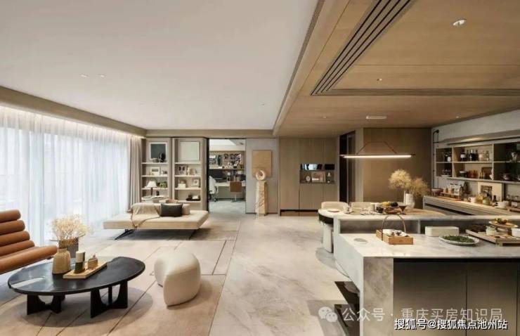 建面125㎡实得面积约151㎡。约20米六开间面宽、约7米L型阔绰横厅、约22㎡空中露台,以及约16㎡岛台化中西双厨,这个户型的第二个优势就是客厅有比较开阔的尺度感。