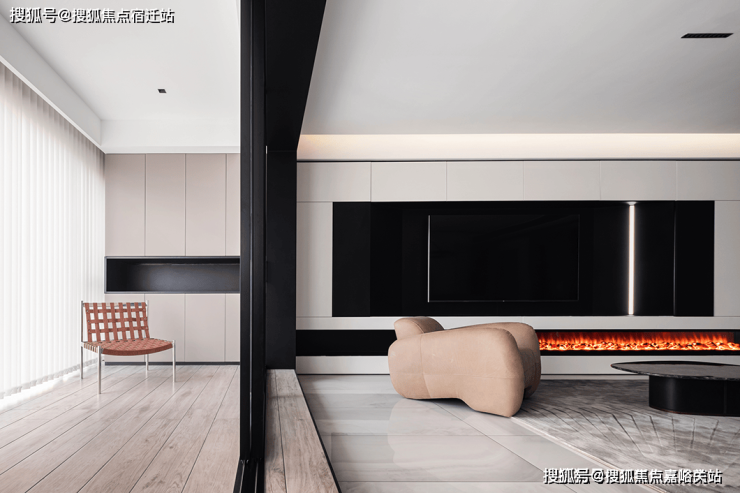 黑白配色的电视背景墙将壁炉纳入这块空间,使得本身冷色调的家瞬间温暖而治愈。