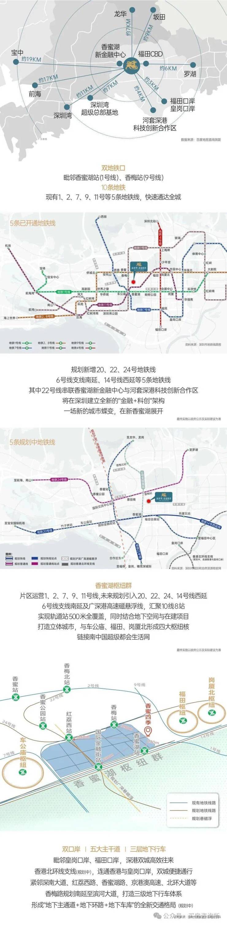 其周边配套也非常齐全,交通配套上, 双地铁,旁边有1号线香蜜湖站与9号线香梅站,距离都在500米左右 ,步行大约需要5-10分钟。