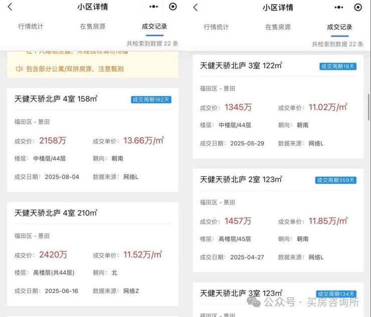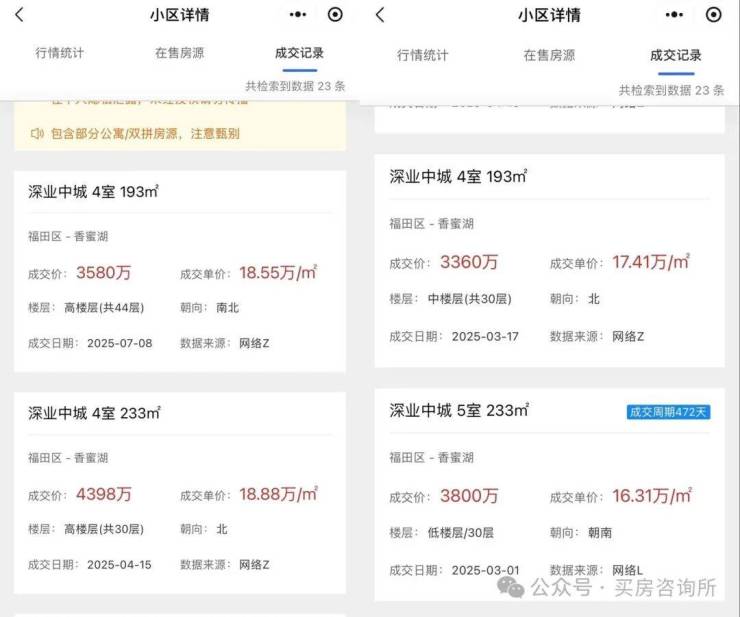 但天健天骄北庐就有点“拖后腿”,2019年8月29日,天健天骄南苑开盘,推出515套90-171㎡住宅,开盘当天售出414套,去化率80%。2020年11月28日,天健天骄北庐开盘,推出207套122-266㎡住宅,备案价11.76万,约4小时售罄。2022年6月,天健天骄西筑开盘,去化约9成。当时开盘价格约为11.4万元/平方米。2025年8月二手房最低价去到了11.52万/㎡,最高价13.66万,主要是同片区新盘竞争太激烈。加上片区随然说靠近香蜜湖但毕竟是属于景田片区,再就是学区没有香蜜湖优质,带的是荔园外国语小学(天骄校区)➕红岭教育集团科技中学。相比上面深业中城不管是地段还是学区都是有所差距的
