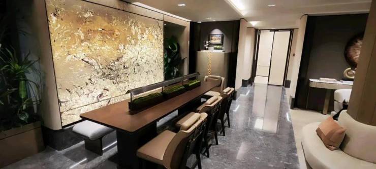 入户大堂,更会感受到一种别样的尊贵体验。顶部仿石材艺术玻璃以其独特的纹理和质感,犒赏着每一位归家的业主。蓝金沙岩板则平添了一份奢华与神秘的美感,让人仿佛置身于一个充满魔力的空间中。而大面积的镜湖春晓岩板,以其淡雅内敛的光泽,带来了一种非同一般的尊贵感。