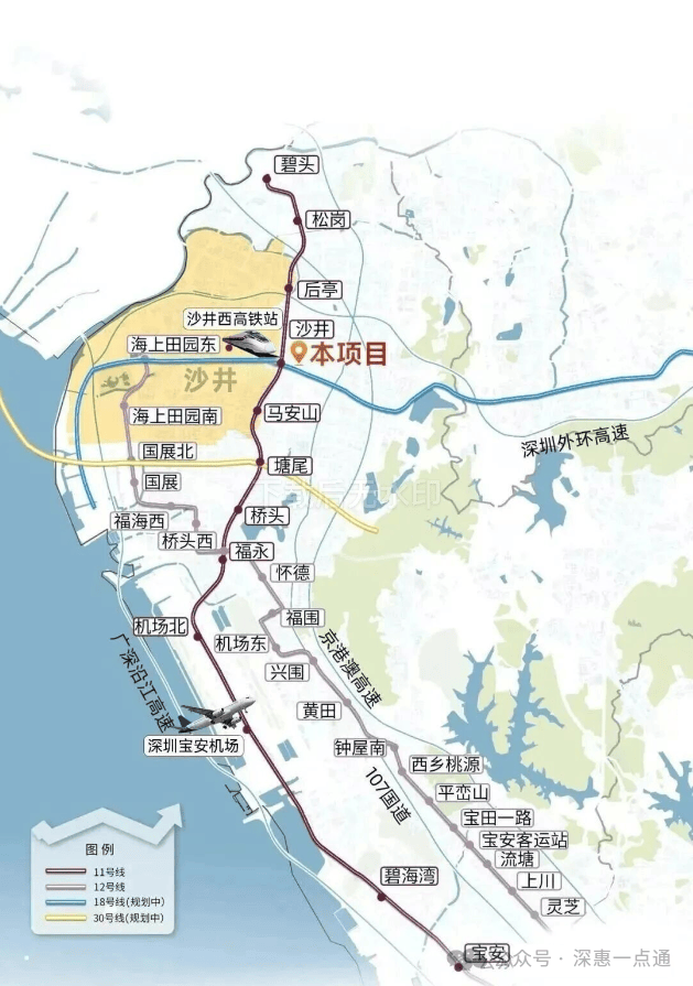 项目距离地铁11号线沙井站步行仅约460米,北侧为百佳华佳漾汇,可满足居住购物与娱乐需求,且2公里范围内有天虹商场、万丰海岸城购物中心,商业氛围较为浓厚。