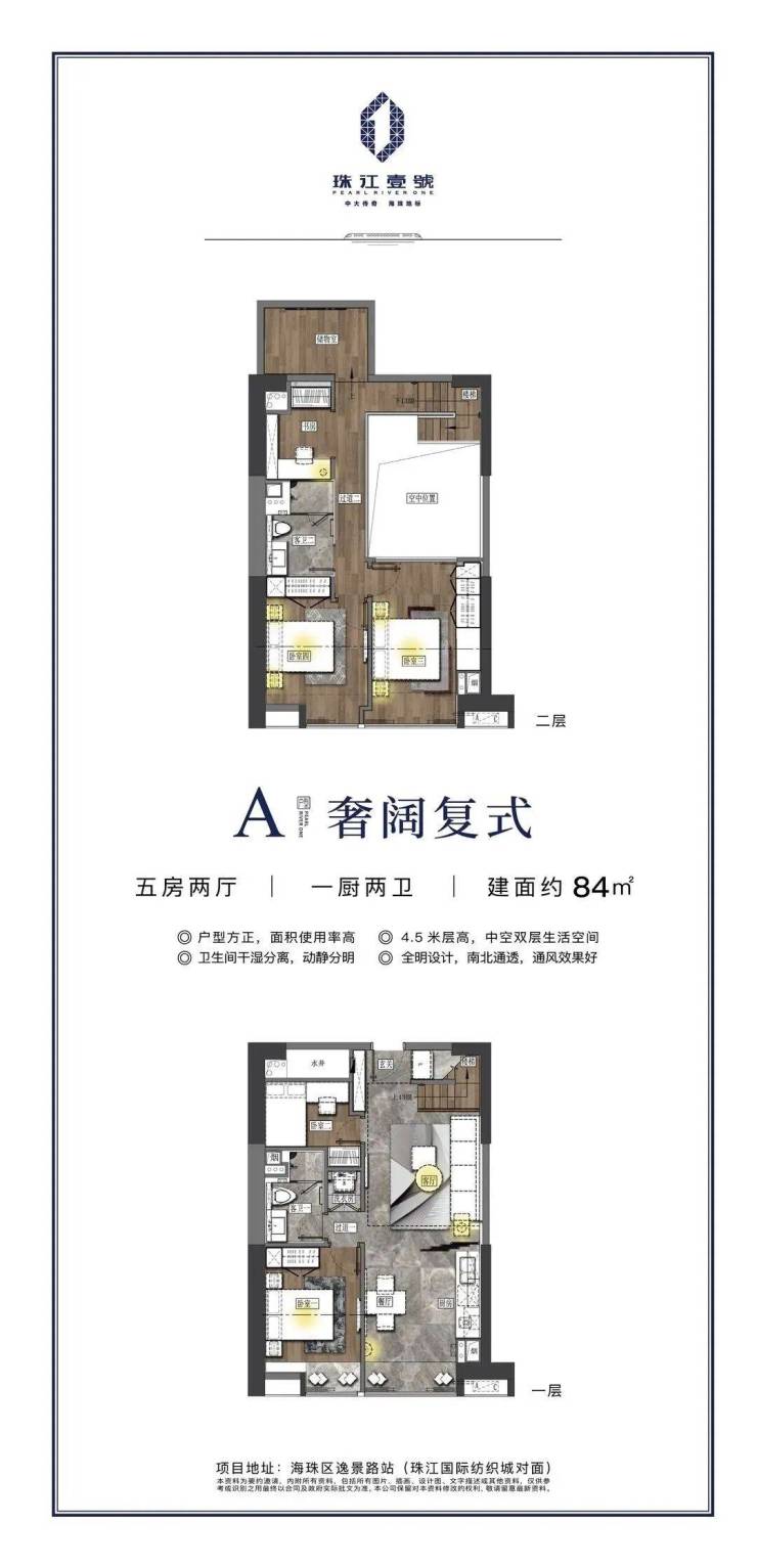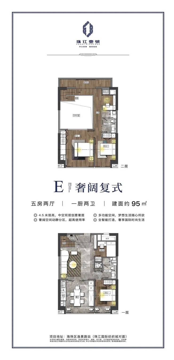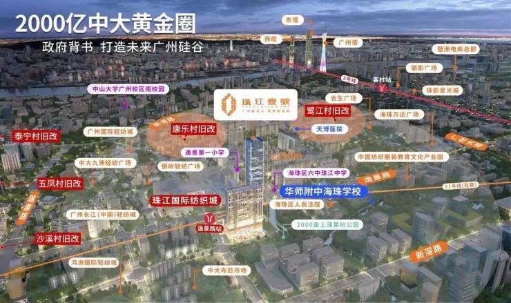 【项目概况】开发商:珠江投资集团物业公司:缦合物业,破亿豪宅同款物业占地面积:约3.7万㎡建筑面积:约31万㎡,LOFT空间约6.8万㎡LOFT层高:约4.5m中空挑高复式面积段:49-95㎡二至五房总户数:875套梯户比:10梯35户层数:共34层(仅25个标准层)拿地时间:2005年交楼时间:2023年6月(预计22年10月可交付)产权年限:50年装修:精装修【交通配套】 5站珠江新城,5站琶洲 11号线逸景路站正上,现场可以看到地铁站正紧锣密鼓施工中。11号线作为大环线,串联起天河、越秀、荔湾、海珠、白云五大中心区,预计将于2022年通车。 项目坐落于2000亿中大商圈之核,与珠江新城、琶洲两大城市CBD,共筑广州商业黄金三角。中大国际创新谷,依托中山大学、中国科学院南海研究所等前沿资源打造重大国际创新谷,将成为集合科研总部、科技孵化、商务配套功能于一体的高品质创新科技集聚区。未来,中大商圈将以中大国际创新谷的全新风貌展现在世界面前,成就比肩世界的“广州硅谷”。珠江壹號凭借其不可复制的核芯地理位置,将成为炙手可热的当红明星。大体量商业旗舰,城芯风向标除了地标的稀缺价值、地铁物业价值之外,珠江壹号还坐拥一站式高端配套等多重优势,万达广场、合生广场以及珠江壹号自带的7万㎡时尚MALL举步即达,汇集全球时尚娱乐休闲,高端餐饮美食,文体商务等全配套生活业态,开启万千精彩生活。