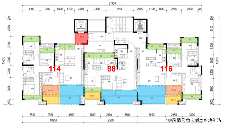 卓越朗宋另一主力户型114㎡做到了四房两卫,且客厅面宽做到了4.5米,且南北通透,接近于目前市面上140㎡的户型格局及尺度。