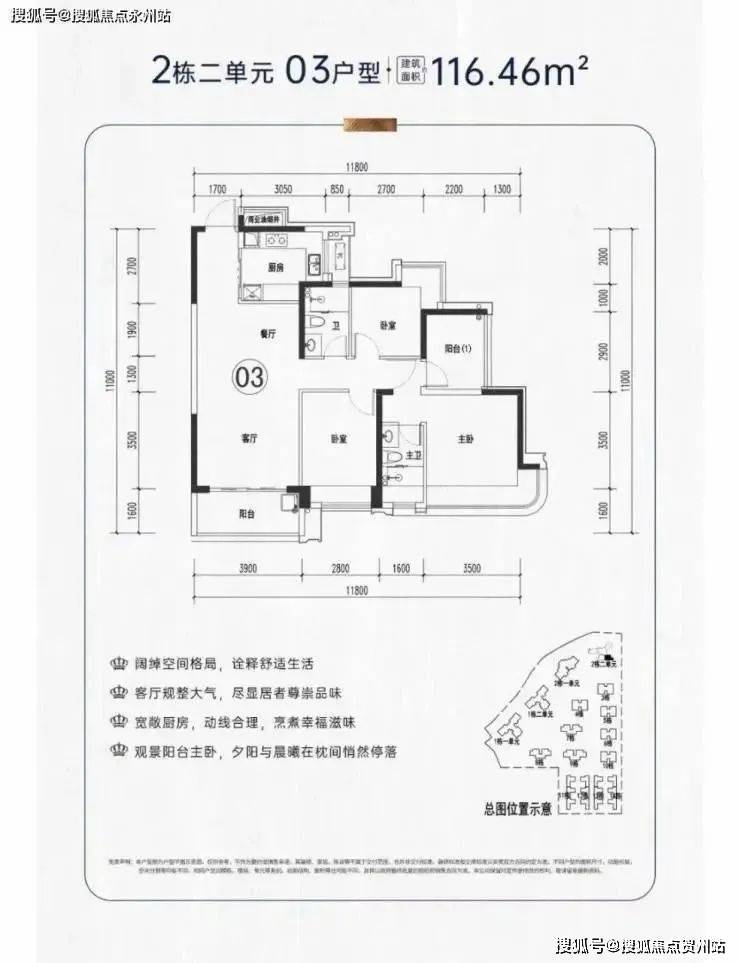 项目户型介绍:社区产品面积段包括112-116-120㎡4房2卫,195㎡4+1房4卫,本次推出116户型4房2卫