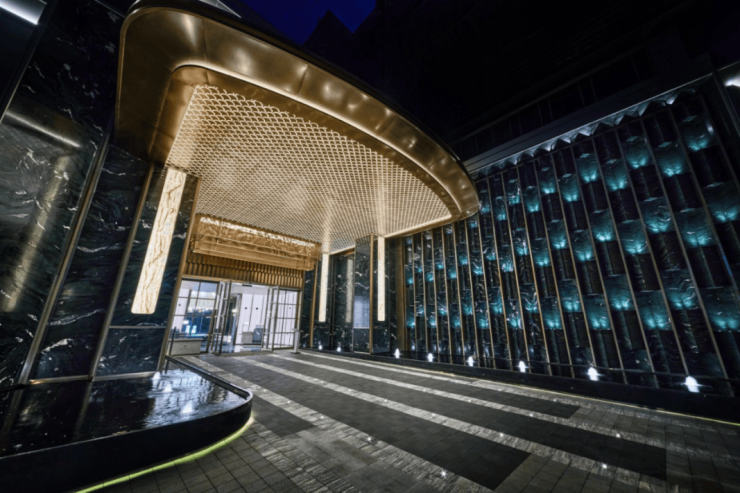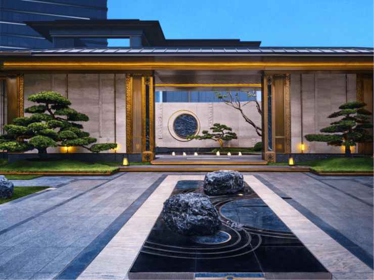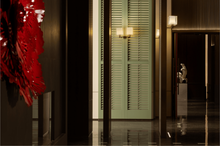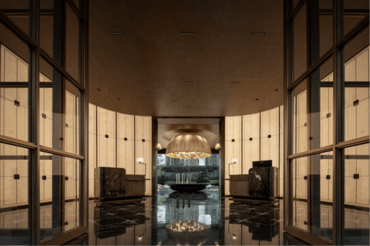 大堂入口,奢与雅在此碰撞。以百达翡绿奢石为景墙,一墙碧色仿佛凝固的千年烟雨;仰首望去,龙鳞纹金属面板覆顶,鳞光微动,似苍龙破空而来。