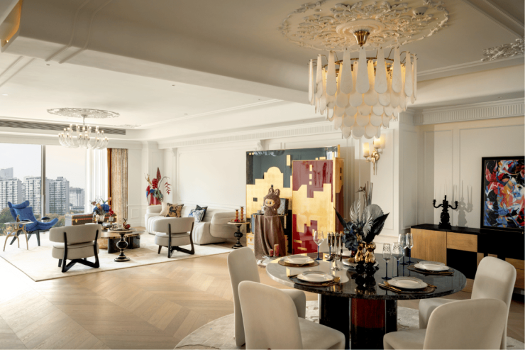 中间套的客餐厅更是达到约100㎡,一张12人的大圆桌也有充足的空间优雅转身。周末约上好友来聚会,给主人赚够了颜面。