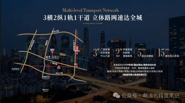 •3横2纵主干道,速通珠金琶,北环高速+广园快速+中山大道/环城高速+科韵路