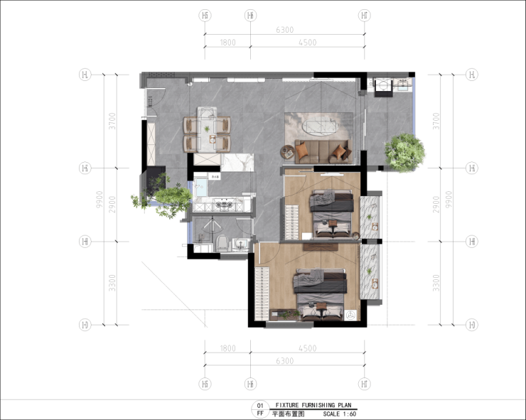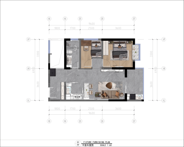 【A-2 建面约60㎡,实际使用面积77㎡, 两室两厅一卫】