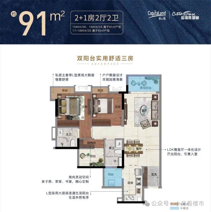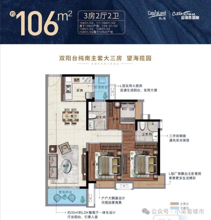 建面85平三房一位,北向,LDK餐客厅一体设计,L型厨房,主卧带L型飘窗,总价160-180万左右。